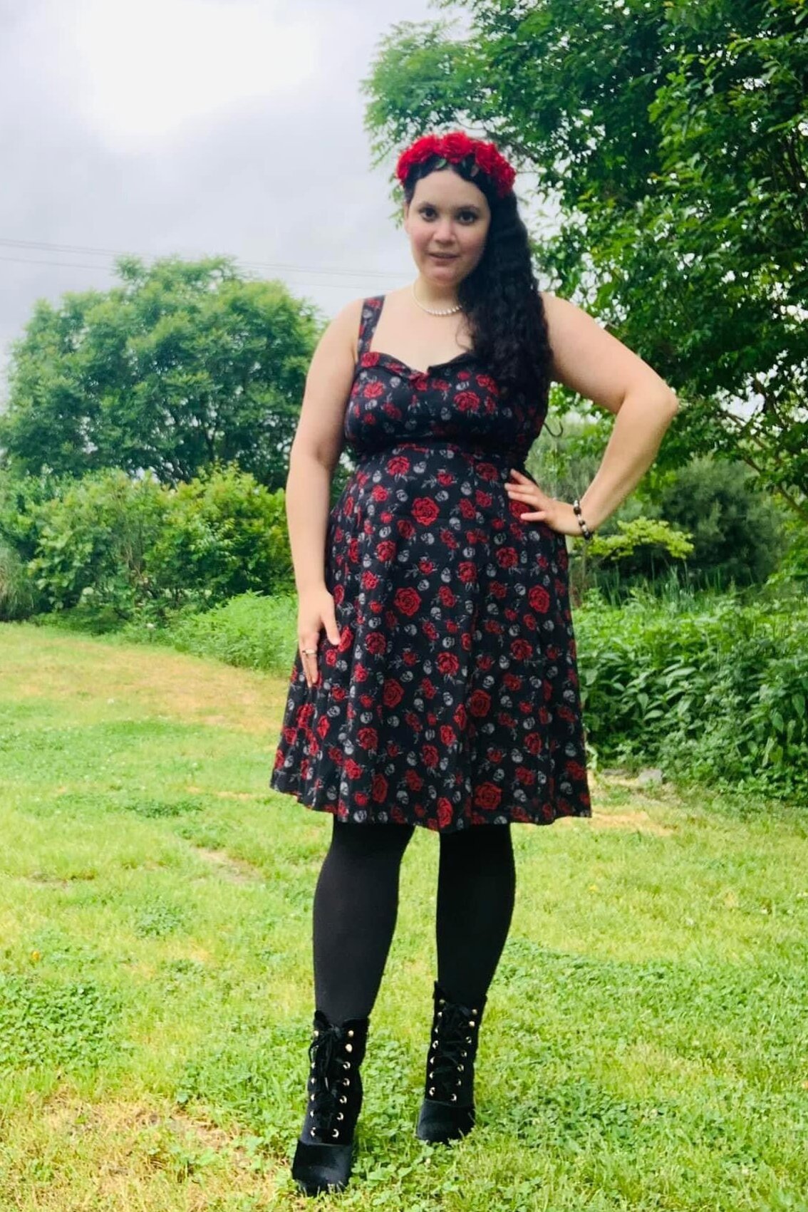 lacyann87 dark hair blogger cute curvy hairband pearls pearl necklace selfie black dress flower print halter top tights black tights ankle boots lace up boots