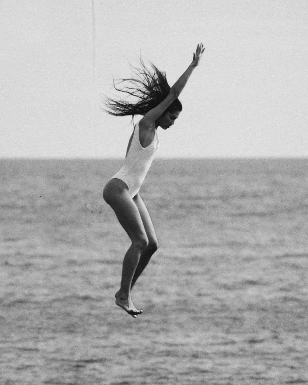 1girl naked nude color outdoors side view acrobatic leaping whole body sand water beach surf
