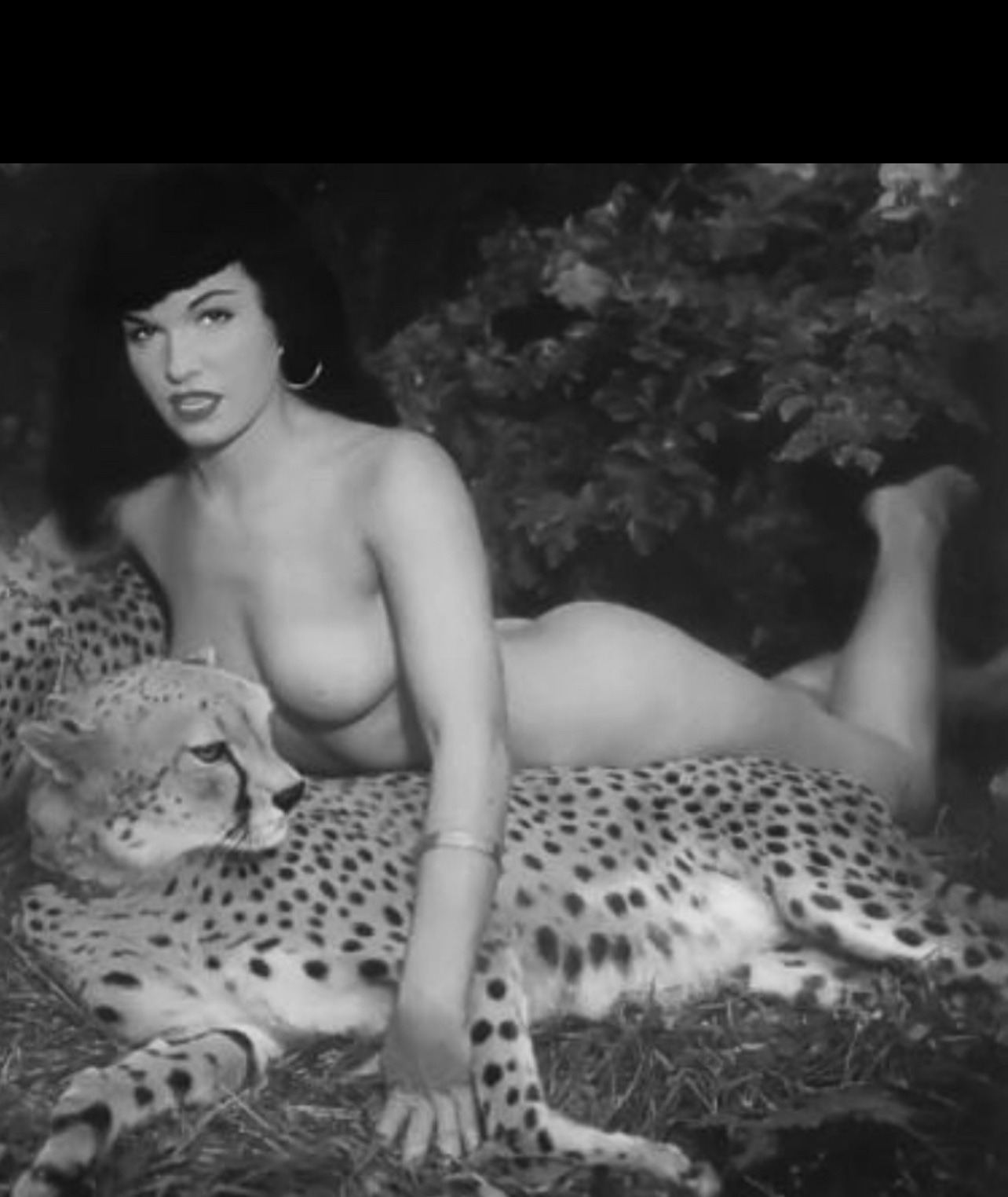 bettie page animal print off the shoulder legs barefoot